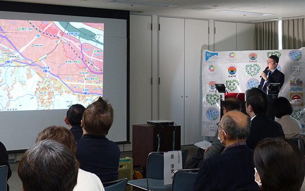 多摩区・3大学連携協議会の活動報告では、専修大学ネットワーク情報学部の佐藤慶一教授が「デジタル技術を活用した防災まちづくり手法の開発」について報告。多摩区の「逃げ地図」(避難所までのルートを時間ごとに色分けして、避難完了までにかかる時間を可視化する地図)のデジタル化や、能登の被災地を学生と共に訪れ、実際の避難状況の記録をもとに、災害時に被災情報が個々に行き渡る技術の開発につなげる取り組みを行っていることなどを報告しました。また、日本女子大学人間社会学部社会福祉学科の黒岩亮子教授は、自らが主催する「地域で活動したい市民のためのキャリアデザインセミナー」について報告を行い、自身のキャリア形成や「越境学習」として捉えることで、ボランティア活動にチャレンジしやすくなる活動として紹介しました。